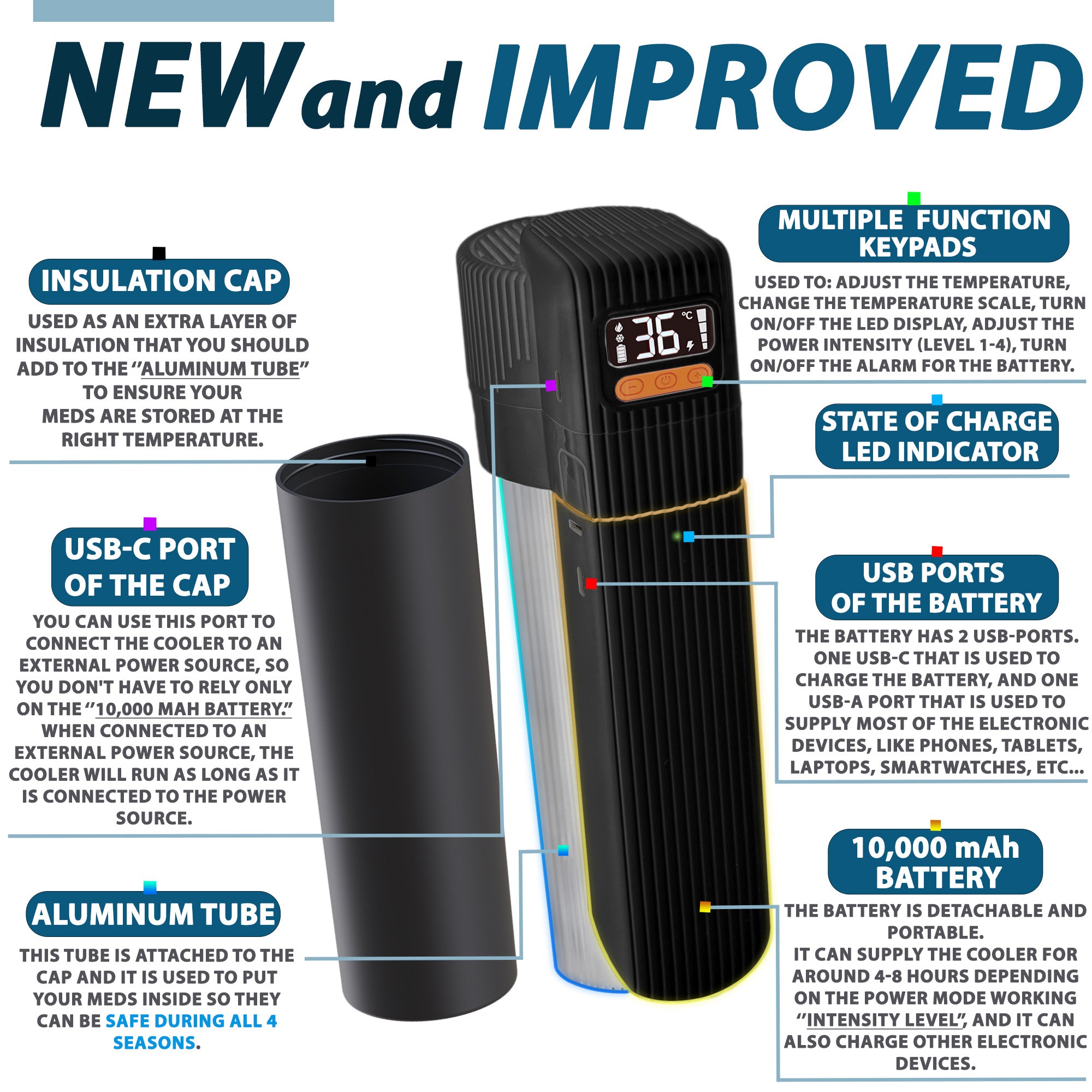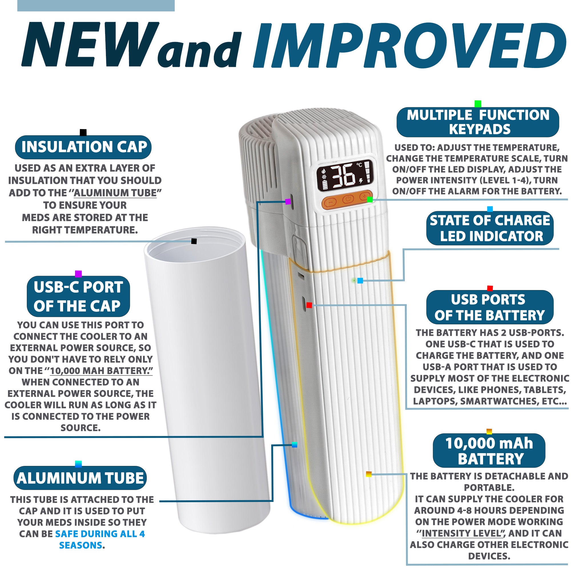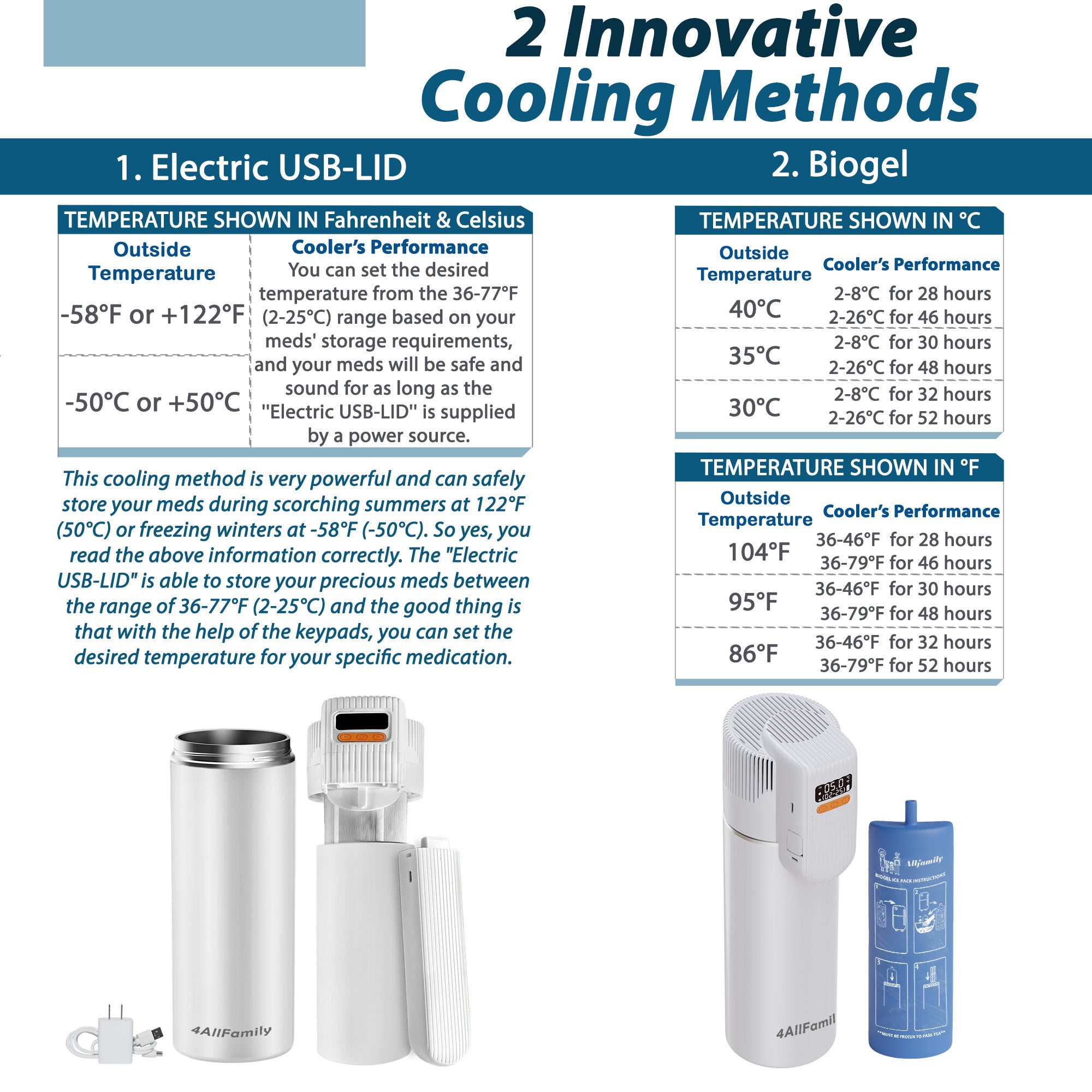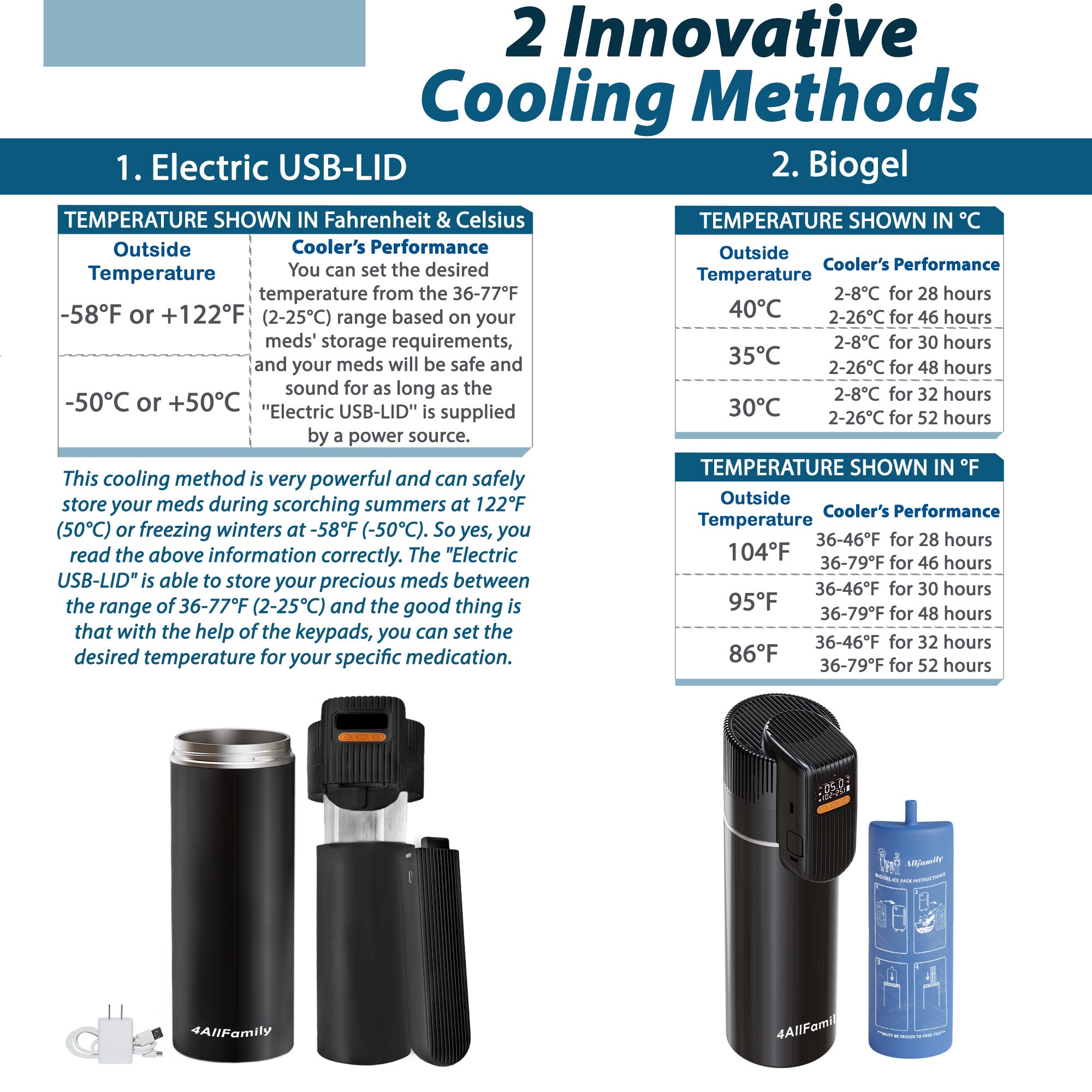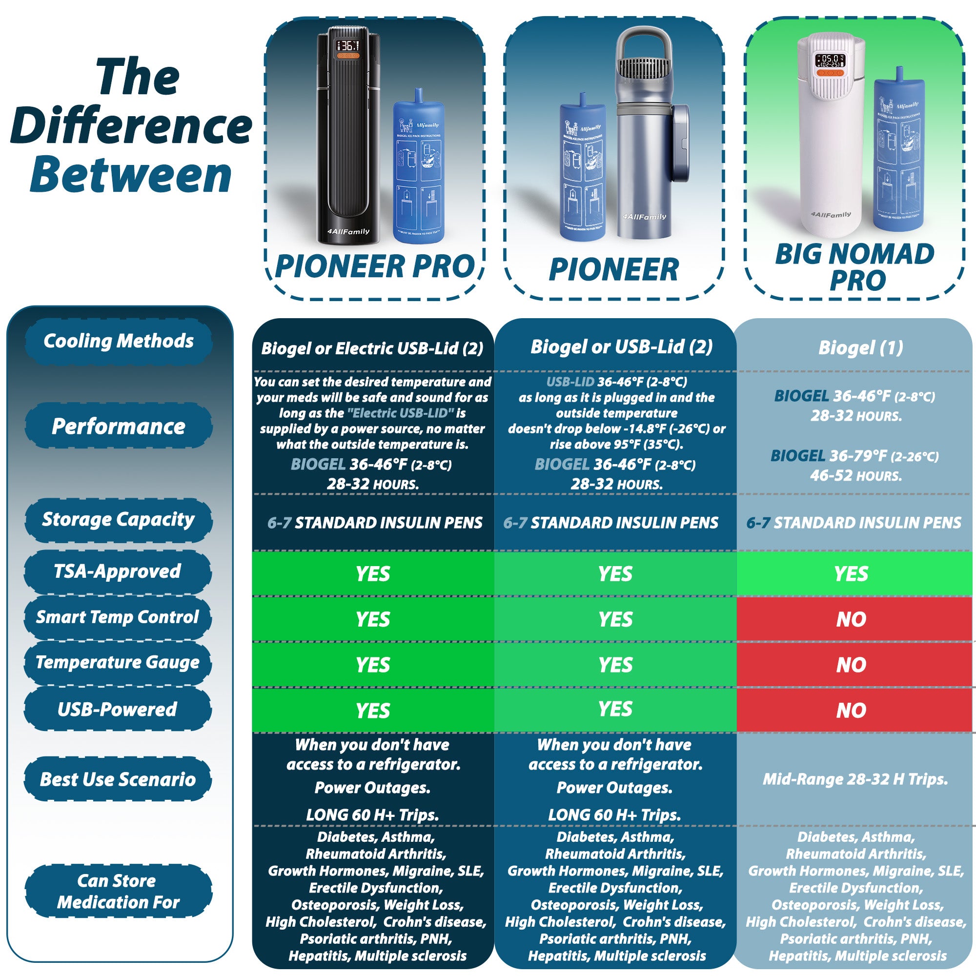El estuche refrigerante de viaje para insulina 4ALLFAMILY Pioneer PRO es una solución premium y lista para viajar, diseñada para mantener tus medicamentos sensibles a la temperatura a un nivel seguro y constante durante el transporte. Ya sea para llevar plumas de insulina, medicamentos GLP-1, autoinyectores de epinefrina u otros biológicos, este estuche para insulina aprobado por la TSA garantiza una conservación adecuada durante horas gracias a su innovador sistema de refrigeración activa alimentada por USB y refrigeración pasiva con biogel.