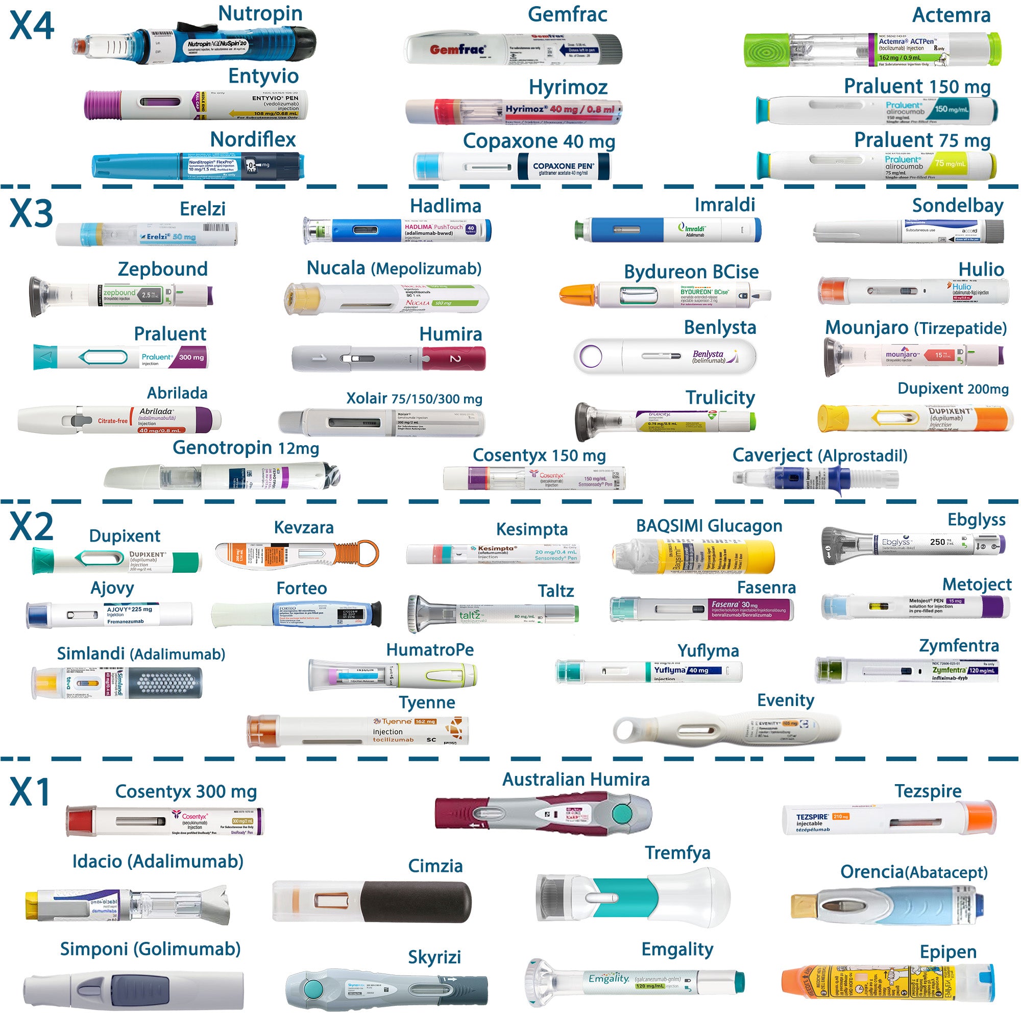 Son compatibles con muchos de los inyectables más comunes, como Humira, Enbrel, Actemra, Orencia, Cimzia, entre otros.