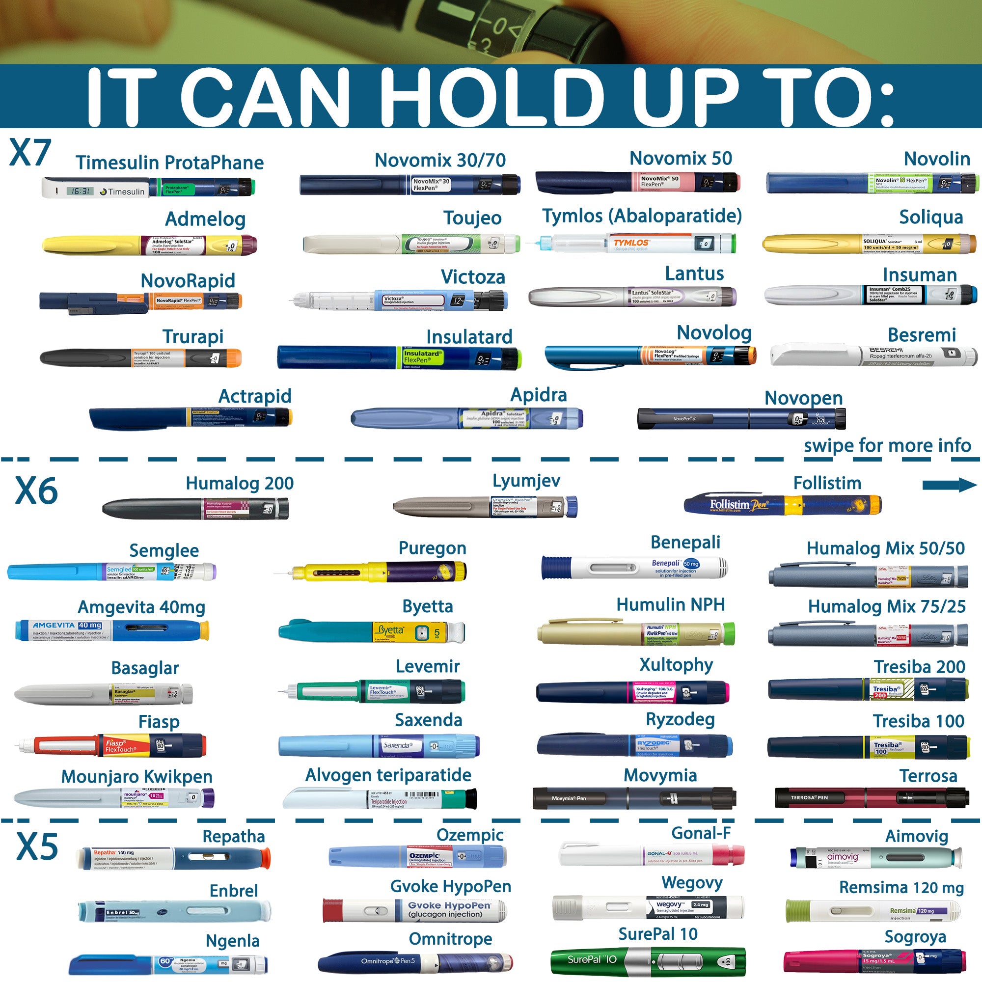 Nuestras neveras para insulina son compatibles con todo tipo de plumas y viales disponibles en España, incluidos: Admelog, Afrezza, Apidra, Basaglar, Fiasp, Humalog, Humulin, Lantus, Levemir, Lyumjev, Novolin, Novolog, Novorapid, Ryzodeg, Toujeo, Tresiba, Velosulin, Xultophy, entre otros.
